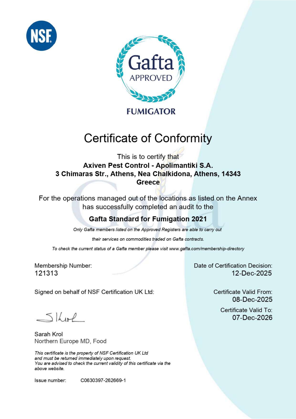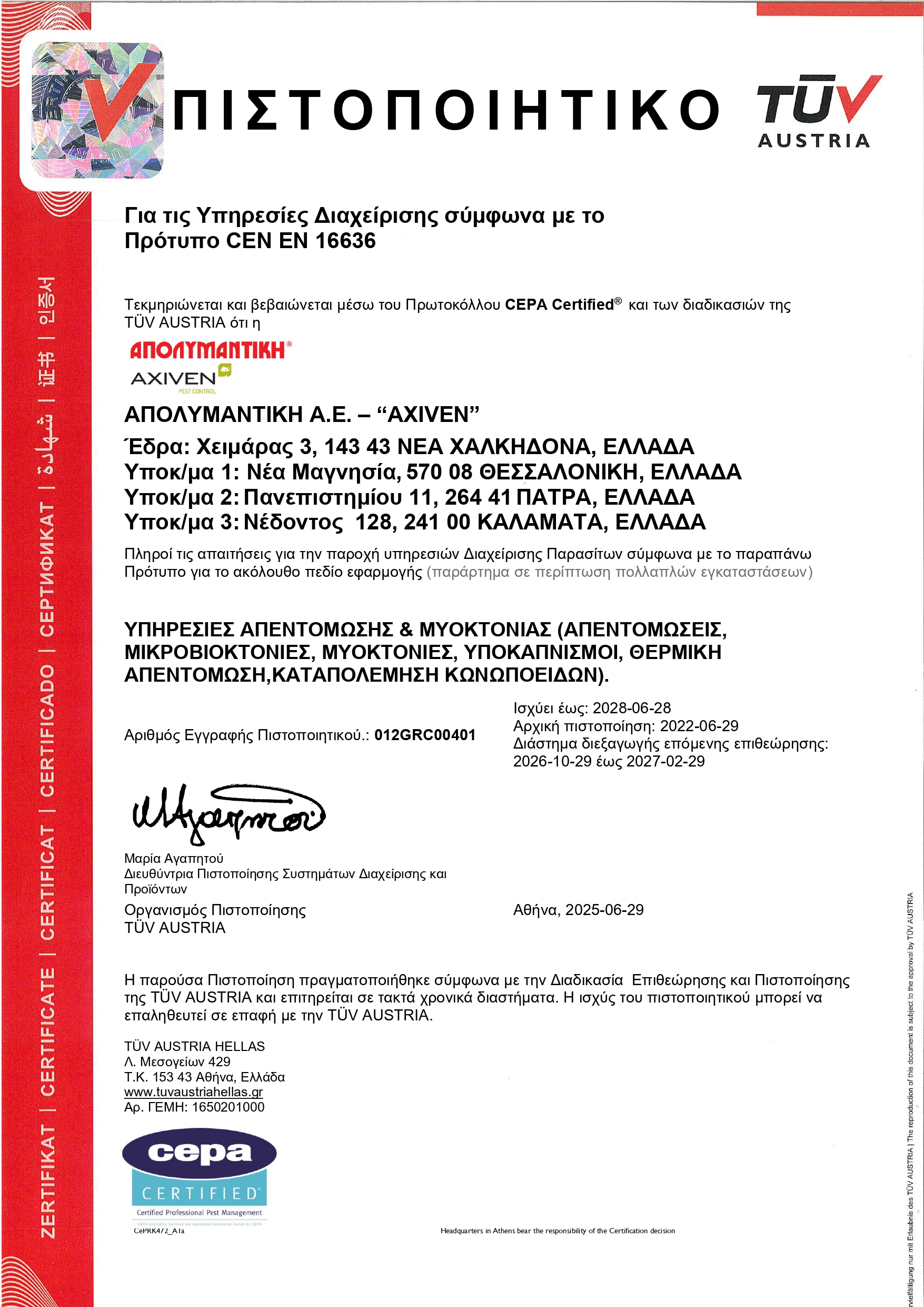 Η αφοσίωση στην ποιότητα γίνεται καθημερινά πράξη στην Axiven Pest Control. Η εταιρεία εφαρμόζει ολοκληρωμένα προγράμματα Απεντόμωσης – Μυοκτονίας αλλά και ειδικές εφαρμογές υποκαπνισμού προϊόντων και αποθηκευτικών χώρων (πλοία,container,silo κ.α.).