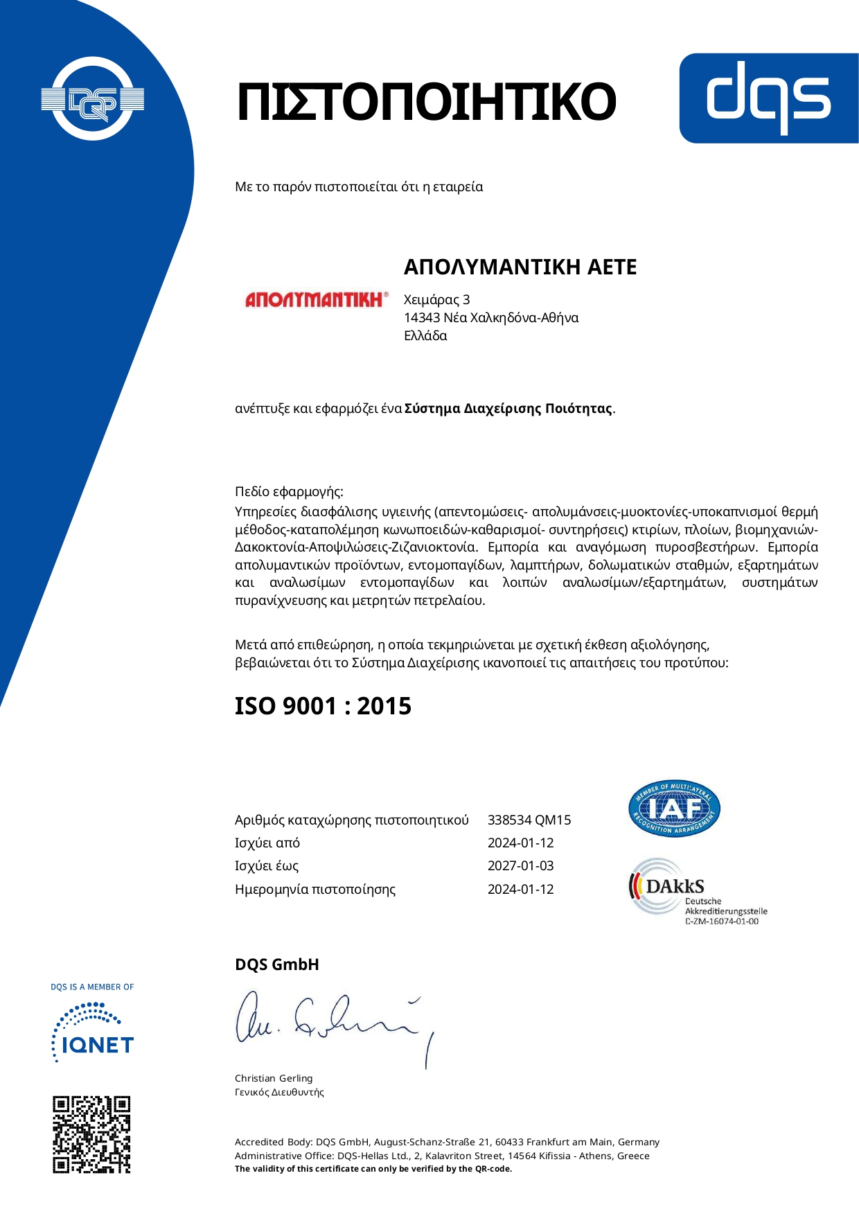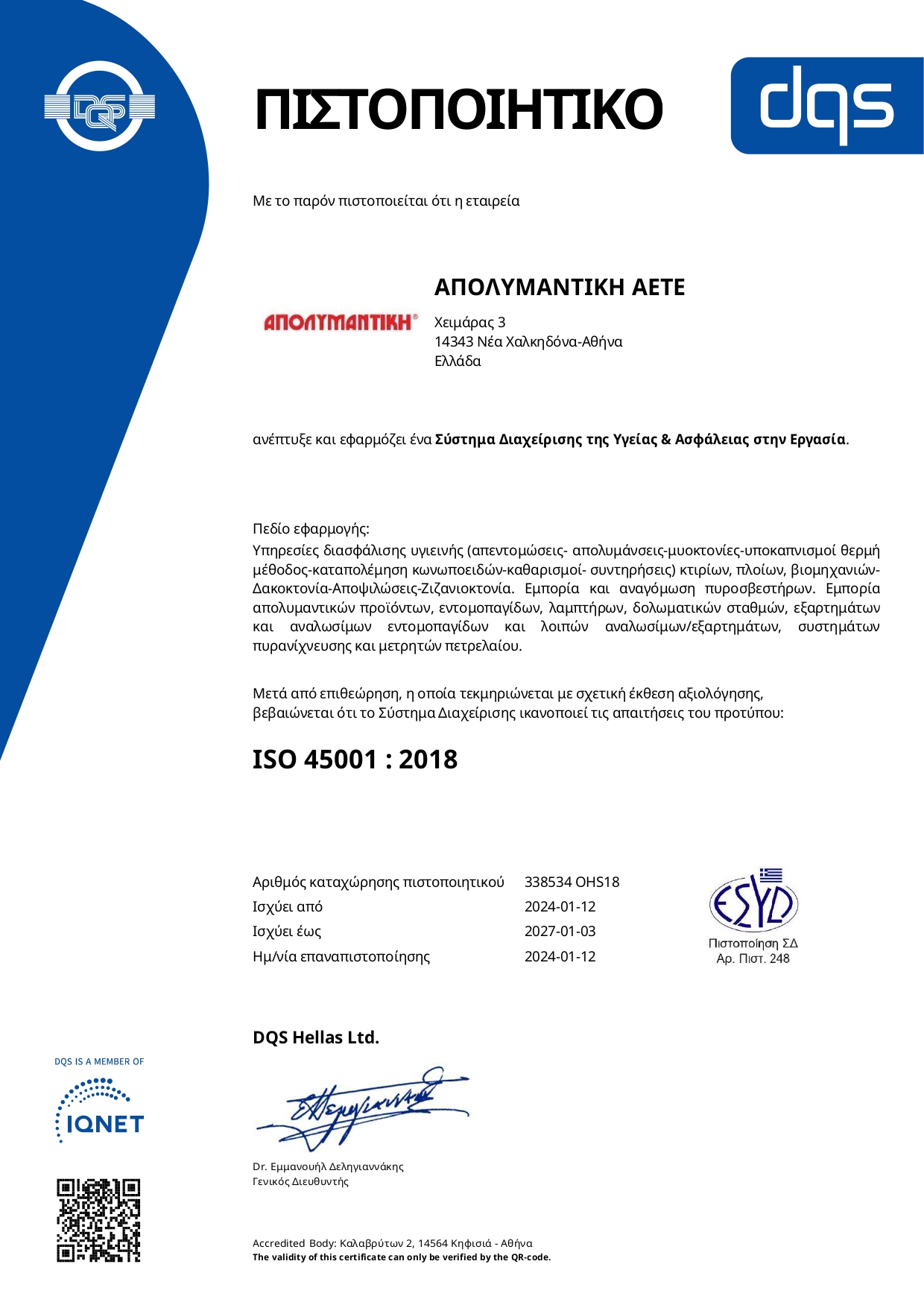 Η εταιρεία έχει εγκαταστήσει Σύστημα Διαχείρισης της Υγείας & Ασφάλειαςστην Εργασία ISO 45001:2018, Σύστημα Διαχείρισης Ποιότητας και Περιβαλλοντικής Διαχείρισης ISO 9001 : 2015 και ISO 14001 : 2015 και CEPA Certified®ΕΝ 16636.